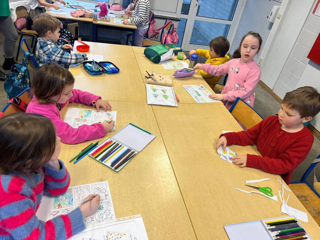 Najmłodsi uczniowie z zaciekawieniem i dużą uwagą słuchali wiersza, a następnie z entuzjazmem odtwarzali jego przebieg z obrazkowej rozsypanki.