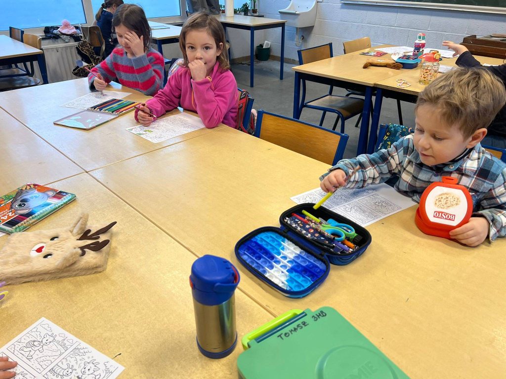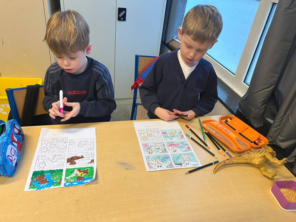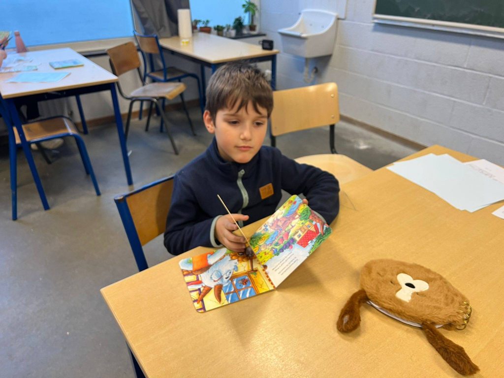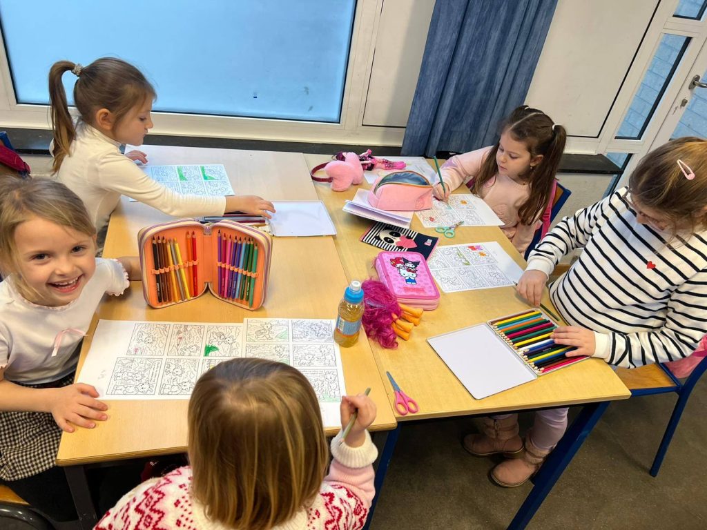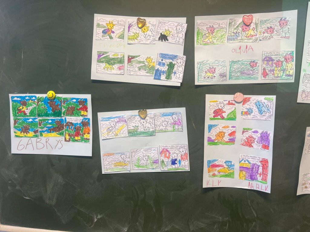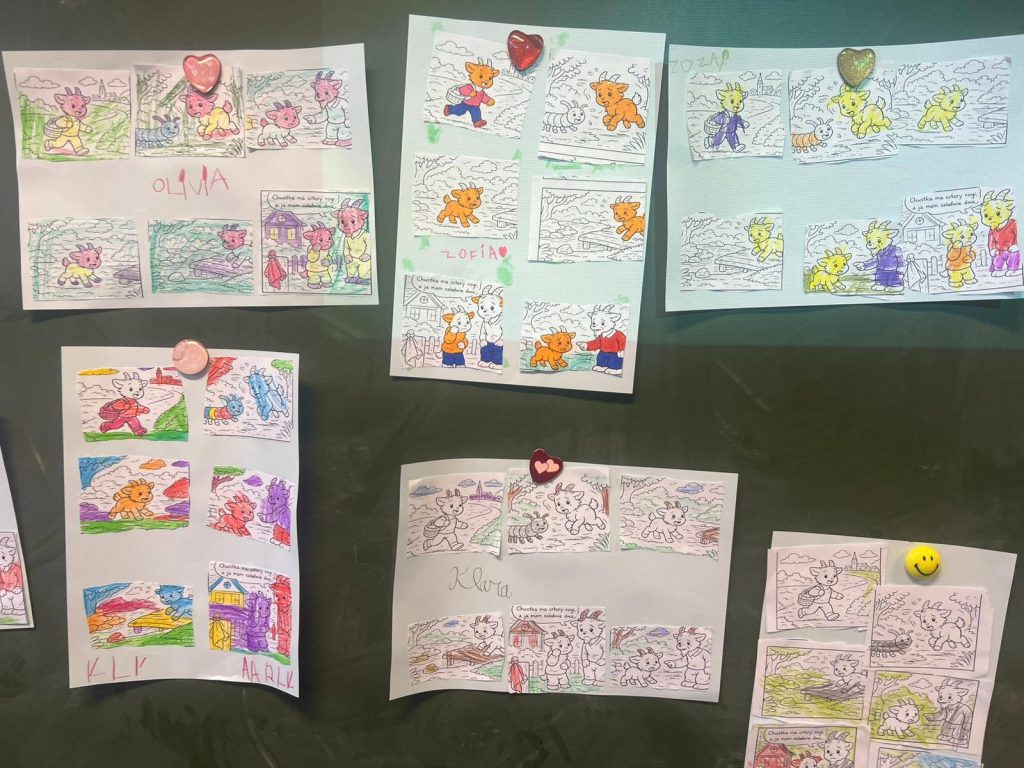 Najmłodsi uczniowie z zaciekawieniem i dużą uwagą słuchali wiersza, a następnie z entuzjazmem odtwarzali jego przebieg z obrazkowej rozsypanki.