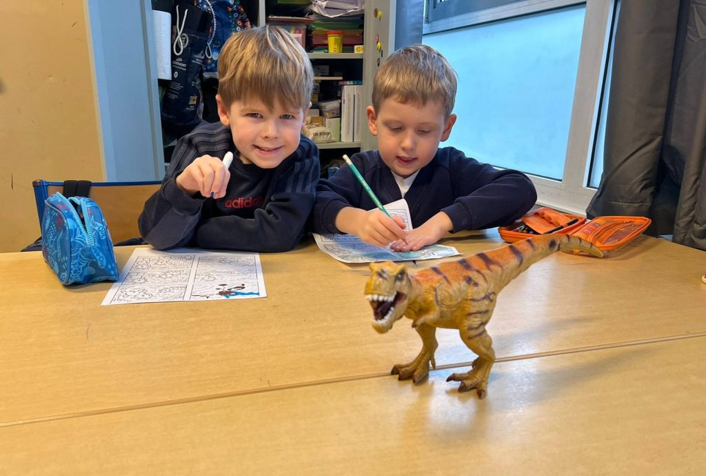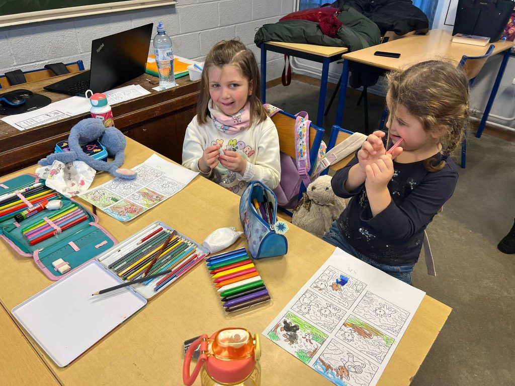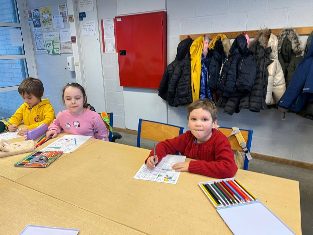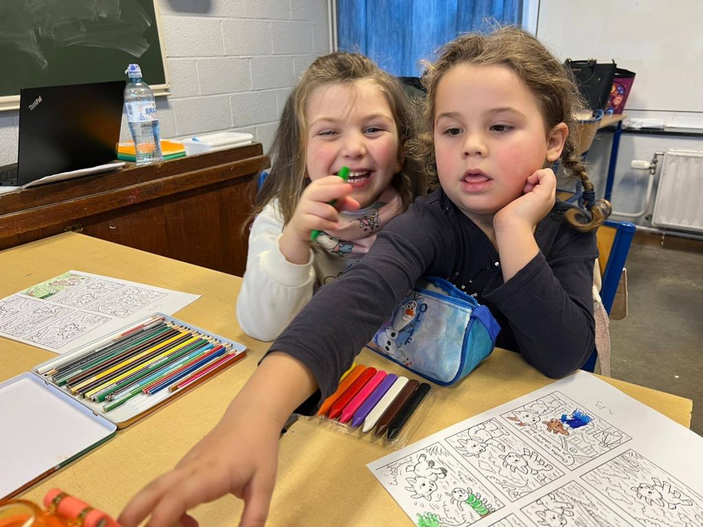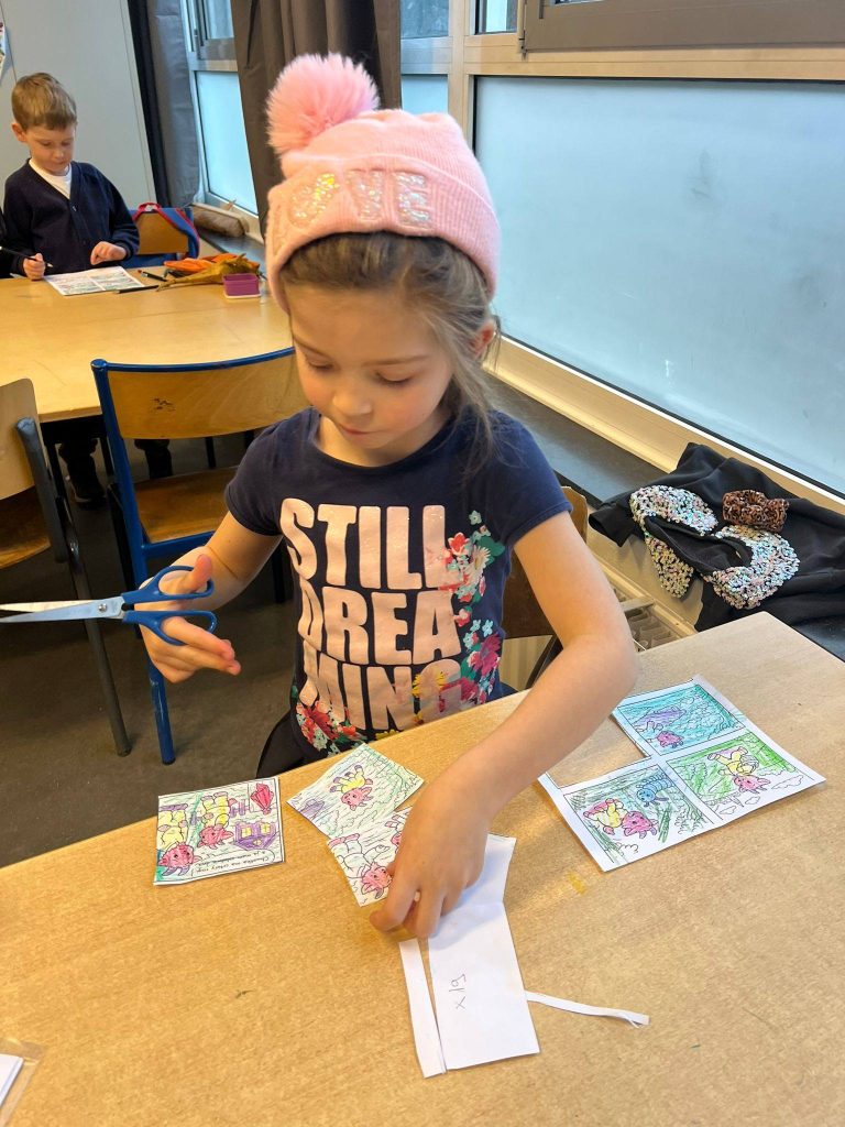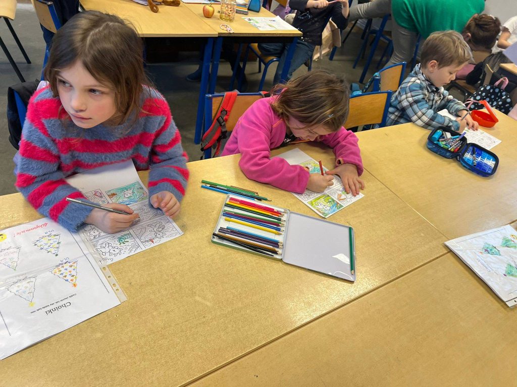 Najmłodsi uczniowie z zaciekawieniem i dużą uwagą słuchali wiersza, a następnie z entuzjazmem odtwarzali jego przebieg z obrazkowej rozsypanki.