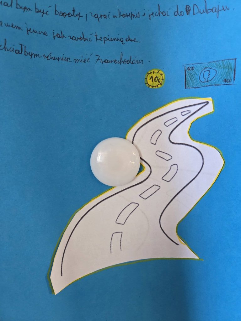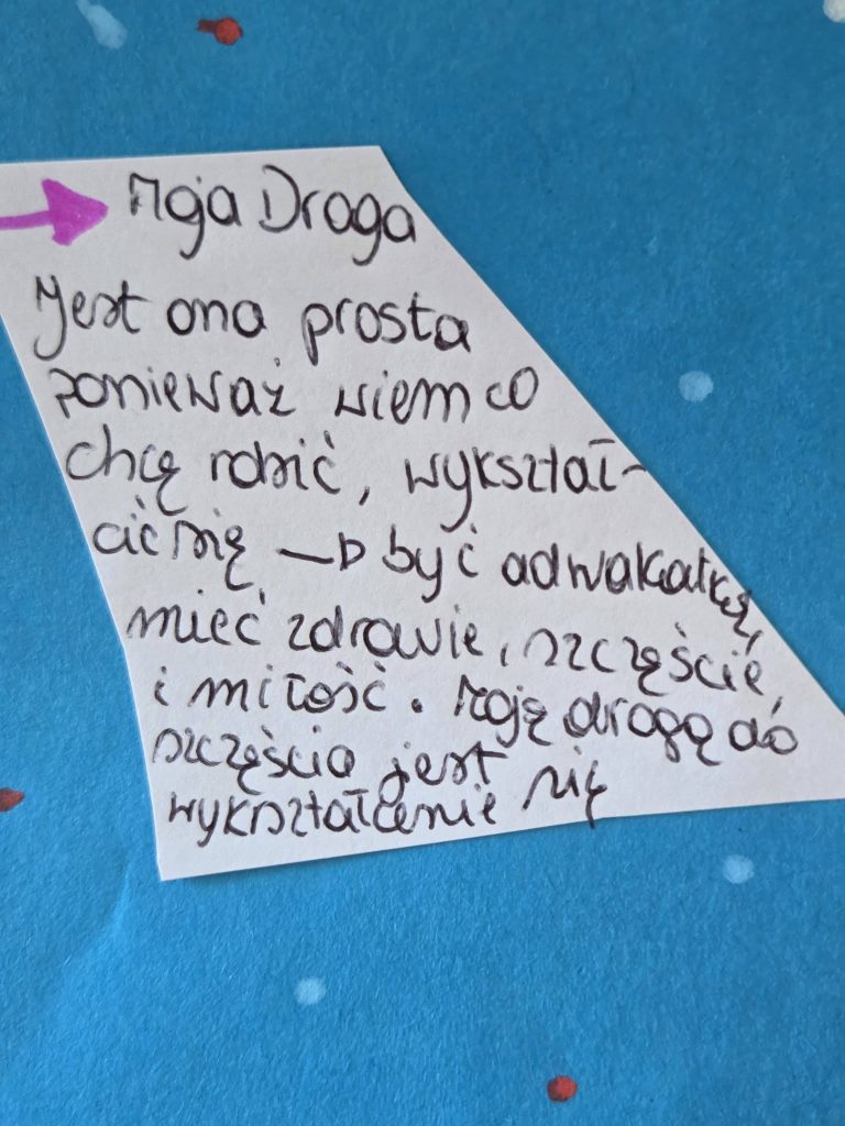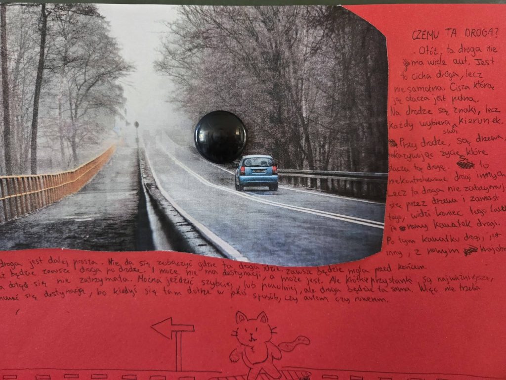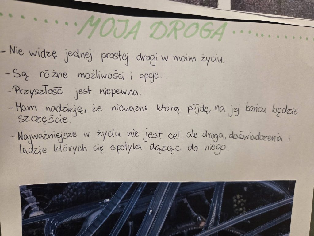 Celem pracy było symboliczne określenie drogi życiowej rozumianej jako suma marzeń, planów, obaw i wyborów. Inspiracją do zadania stał się omawiany na lekcjach fragment prozy Wiesława Myśliwskiego pt. „Droga”.
