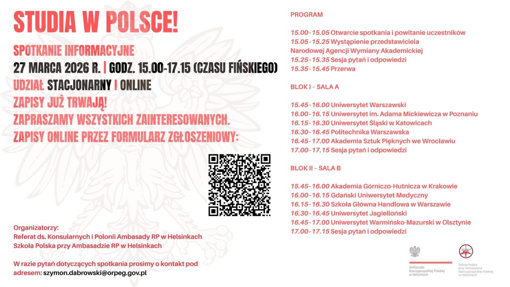 Zapraszamy uczniów, rodziców oraz wszystkie osoby zainteresowane na spotkanie informacyjne o studiowaniu w Polsce, które odbędzie się 27 marca 2026 r. w formule hybrydowej — na miejscu w Helsinkach oraz online na MS Teams.